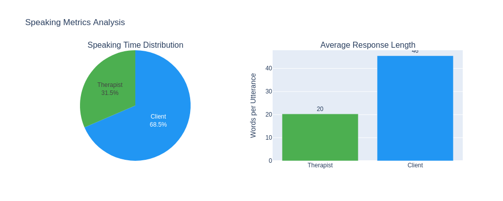 The speaking ratio (Therapist: 31.5%, Client: 68.5%) approaches the golden mean of therapeutic interaction. This represents what D.W. Winnicott might call "good enough" therapy - the therapist provides sufficient holding while allowing space for the client's narrative to unfold.